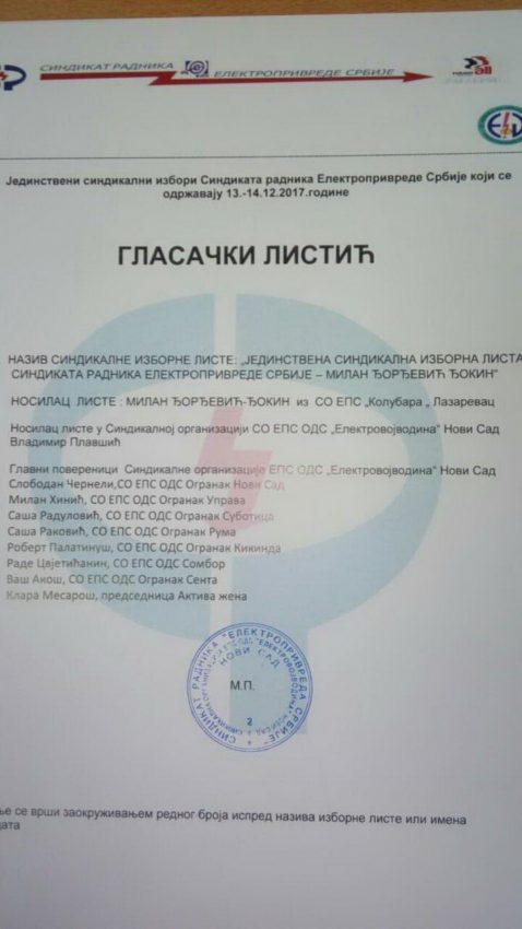 Na spornim izborima učestvuje samo jedna jedistvena lista koju predvodi aktuelni predsednik Sindikata EPS-a Milan Đorđević Đokin. Na listiću u Vojvodini nosilac liste je smenjeni predsednik Sindikata Elektrovojvodine Vladimir Plavšić i osam predstavnika elektrodistribucija Subotica, Ruma, Kikinda, Sombor i Senta.