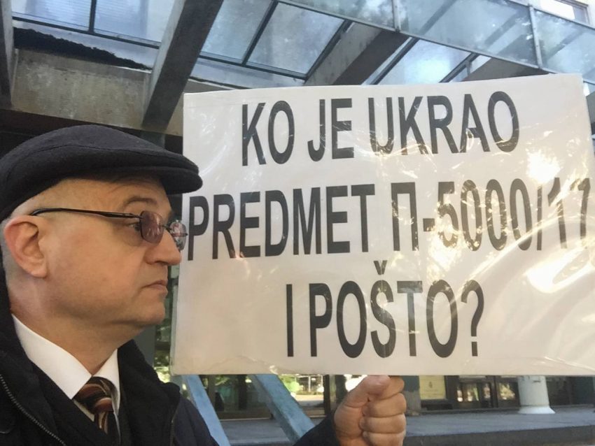 Krstin je stajao ispred suda sa transparentom u rukama na kojem je pisalo: “Ko je ukrao predmet 5000/17 i pošto?”