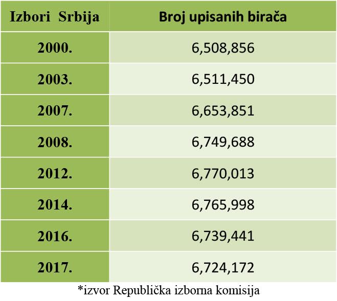– Ne sumnjam da su se potrudili da ih dokažu, ali naravno nisu uspeli u tome, nisu ni mogli jer to nije bila istina. A broj birača za koji su tvrdili da je „naduvan“, na narednim izborima bio je sve veći – rekao je Šabić. To potvrđuju brojke po kojima je broj birača u Srbiji, suprotno svim tendencijama pada broja stanovnika, godinama rastao. Najviše upisanih je bilo 2012. čak 6.770.013, da bi nakon toga broj neznatno opao, ali je i dalje veći nego pre 17 godina.
