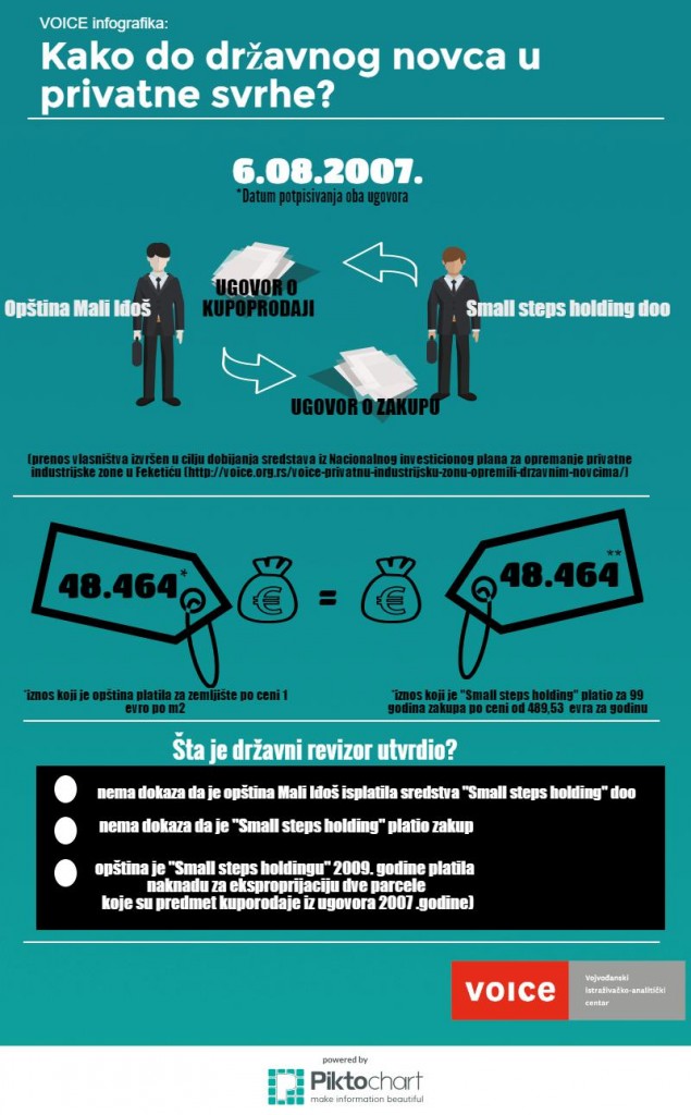 DRI je dostavio tužilaštvu informacije i dokaze o sumnjivim radnjama čelnika opštine Mali Iđoš sa privatnim holdingom. VOICE je u okviru istraživanja obelodanio i sadržaj dva ugovora od 6. avgusta 2007. godine. U jednom danu, opština je od privatnog preduzeća prvo kupila, a potom istom preduzeću isto zemljište izdala pod zakup od 99 godina. Povod za neobičnu transakciju bila je namera da lokalna samouprava u korist opremanja industrijske zone u vlasništvu privatnog holdinga konkuriše za državna sredstva kod tadašnjeg Nacionalnog investicionog plana (NIP).