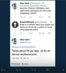 Par dana ranije, Vacić je na tviteru podelio tekst sa naslovom „Vojska Srbije spremna: Ako Šiptari napadnu, za tri sata uzimamo sever“. Na pitanje jednog tviteraša ko će da ratuje, Vacić napisao: „Tvoja deca će da idu. Ja ću ih lično mobilisati“. Nakon žustre rasprave i preko stotine negativnih komentara, Vacić je izbrisao tvit.