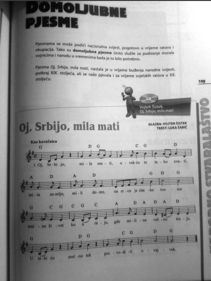 U odeljku Domoljubne pesme u pomenutom udžbeniku nalazi se pesma “Oj, Srbijo, mila mati”, molitva “Oče naš” je u pravoslavnoj verziji, u udžbeniku je i melodija državne himne Srbije “Bože pravde”, a tu je i himna Svetom Savi, kao i pesma “Kreće se lađa francuska”.