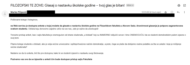 Istovremeno ipak, dok su zaposleni na fakultetu rešavali problem sa informacionim serverima, studentima tog fakulteta masovno je stizao poziv da se na anketu odazovu.