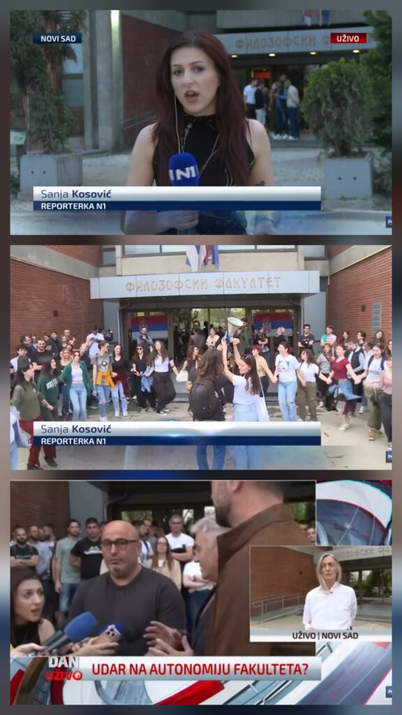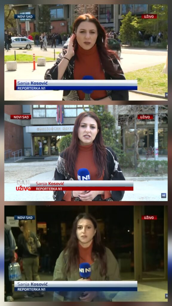 Da Ksenija Pavkov nije izveštavala sa tih skupova odmah je dokazao Fake news tragač, a proverili smo i mi u emisijama koje su dostupne na Youtube-u. O dešavanjima ispred novosadskog Filozofskog fakulteta i unutar njega izveštavala je Sanja Kosović, novinarka televizije N1 iz Novog Sada.