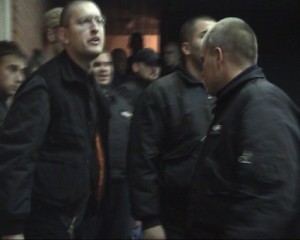 Mario Vrselja (levo iza Davidovića) kao „slučajni posetilac“ tribine u društvu sa pripadnicima Nacionalnog stroja