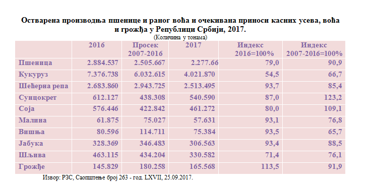 Kada je o padu poljoprivredne proizvodnje reč, analitičari, imajući u vidu podatke zavoda za statistiku, dolaze do toga da je ostvarena proizvodnja pšenice od 2,278 miliona tona, što je za 21 odsto manje u odnosu na proizvodnju u 2016. godini. Očekivana proizvodnja kukuruza je 4,022 miliona tona, što je za 45,5 odsto manje u odnosu na proizvodnju ostvarenu u prošloj godini. U poređenju sa prošlom godinom, očekuje se manja proizvodnja šećerne repe (6,3 odsto), suncokreta (13 odsto), soje (20 odsto).