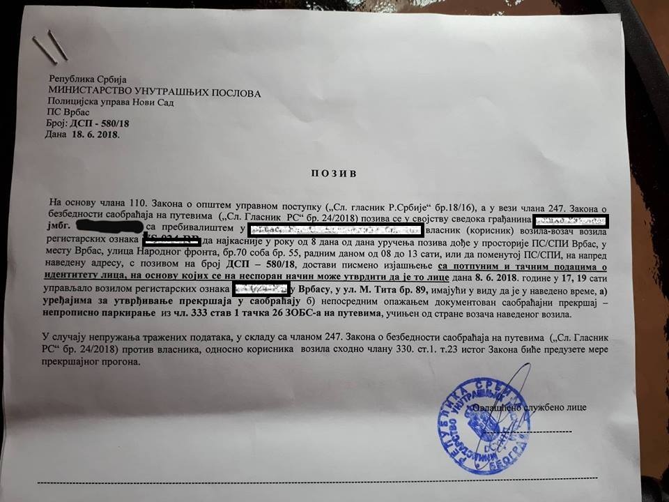 Poziv da se jave u policijsku stanicu i izjasne ko je na dan blokade upravljao njihovim automobilom stigao je do sada na adrese desetak građana opštine Srbobran i isto toliko u opštini Vrbas.